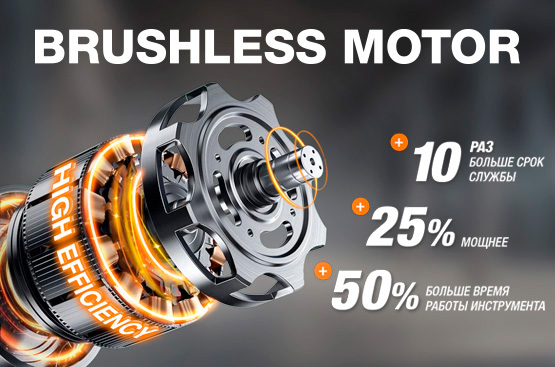 Обладает повышенной мощностью, развивает высокие обороты, обладает долгим сроком службы и все это при меньшем потреблении энегии, по сравнению с щеточными аналогами.
